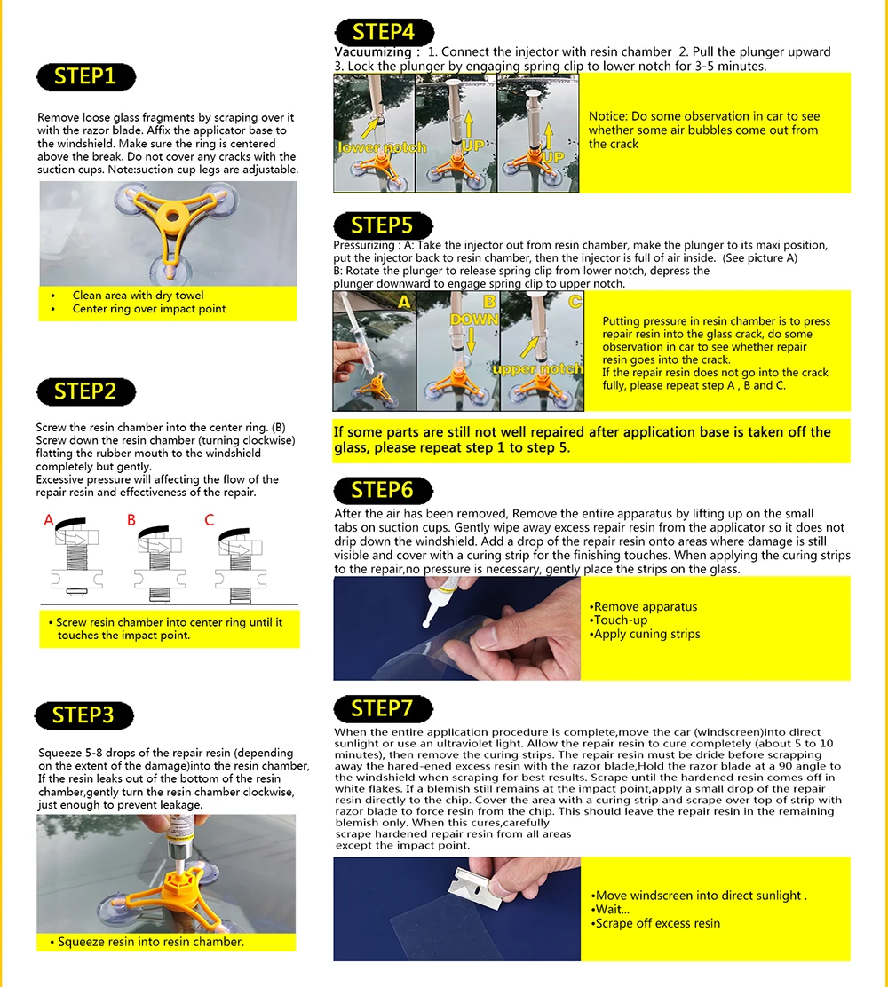 Its PATENTED DESIGN evacuates air to fill the cavities with our innovative LIQUID GLASS to REPAIR cracks and chips, even preventing the spread of damage.